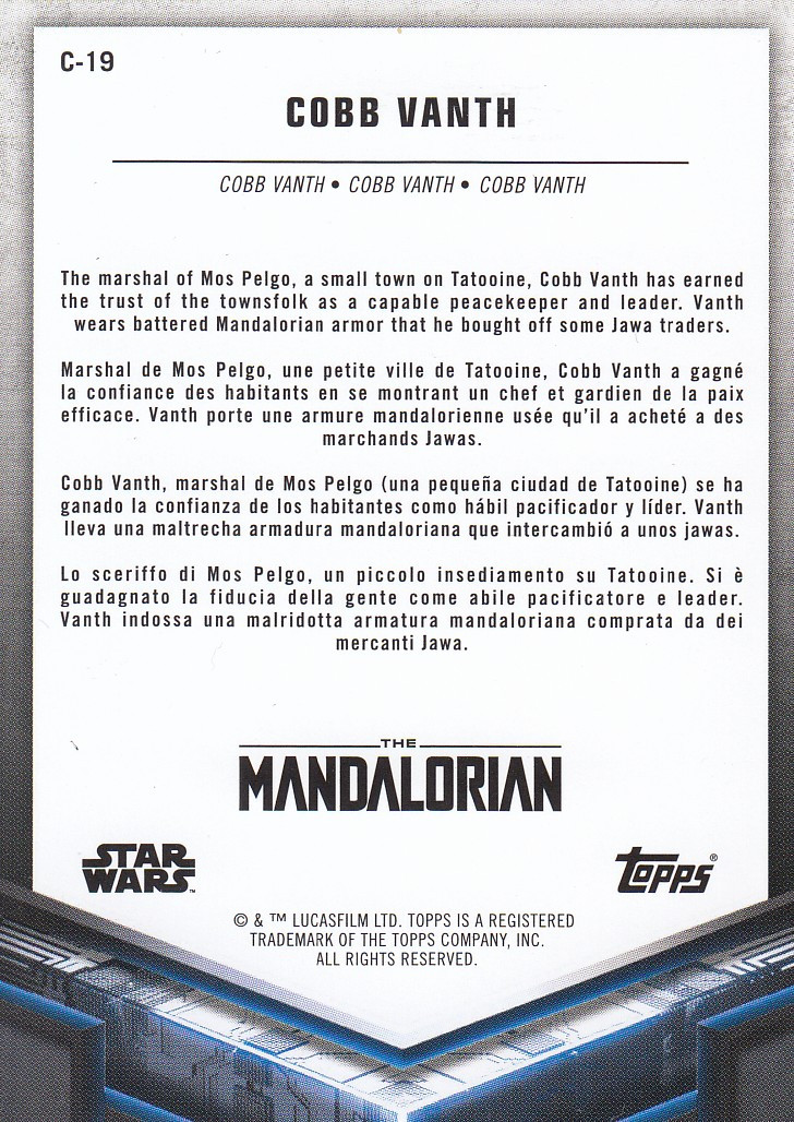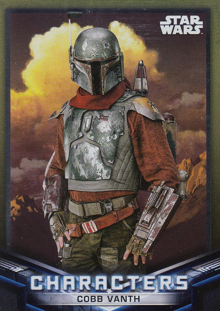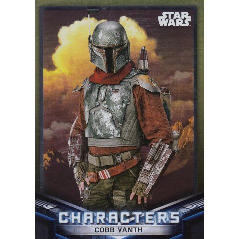 This collectible Gold Foil Parallel insert card features Cobb Vanth, the self-appointed marshal of Mos Pelgo, as seen in The Mandalorian Season 2. Released in 2021 by Topps as part of the Star Wars: The Mandalorian Seasons 1 & 2 trading card set, this limited-edition parallel highlights Vanth’s rugged heroism and frontier justice with striking metallic gold accents.