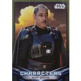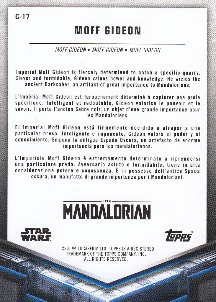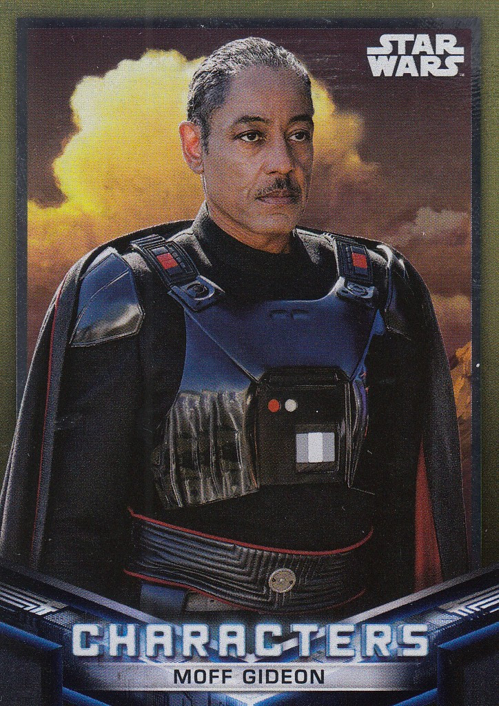 This collectible insert card features the calculating Imperial officer Moff Gideon, as portrayed by Giancarlo Esposito in The Mandalorian Seasons 1 and 2. Released in 2021 by Topps as part of the Star Wars: The Mandalorian Seasons 1 & 2 trading card set, this Gold Foil Parallel edition captures the commanding presence and quiet menace of one of the New Republic era’s most dangerous adversaries.