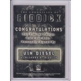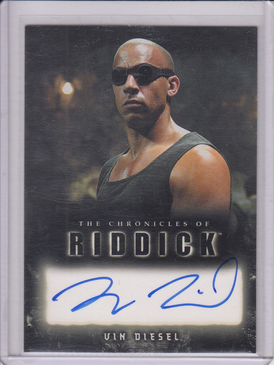 This rare autograph card features the authentic signature of Vin Diesel, who brought to life the legendary anti-hero Richard B. Riddick across the cult-favorite Riddick saga, including Pitch Black (2000), The Chronicles of Riddick (2004), and Riddick (2013).