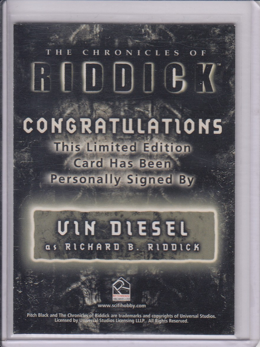 Printed on premium stock and featuring a striking image of Diesel in character, this autograph card delivers a tangible connection to the actor and the role that helped define his career. A must-have center piece for Riddick fans and autograph collectors alike.
