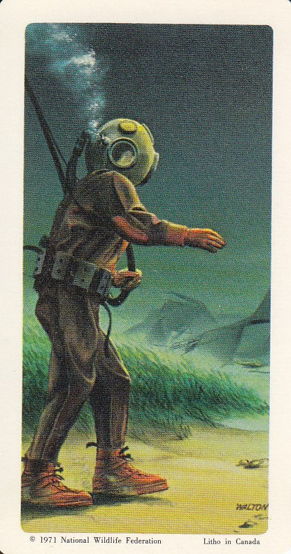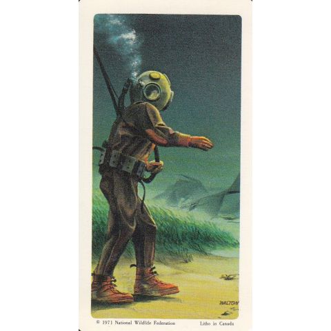 Originally released with Brooke Bond tea products, this beautifully illustrated card showcases an early deep-sea diver in a traditional brass diving helmet, symbolizing mankind’s first steps into the ocean’s mysterious depths.